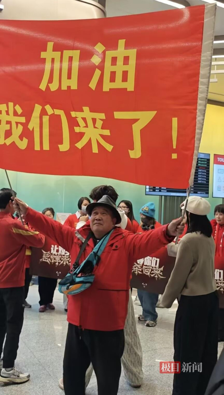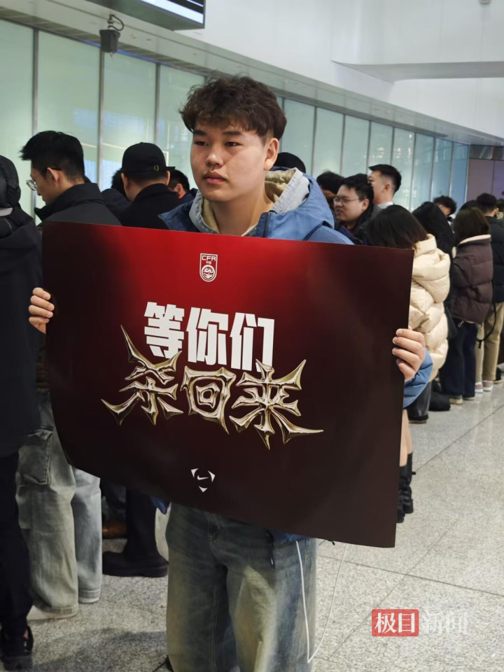 极目新闻记者在现场看到体育集锦,还有球迷举着“等你们,杀追想”的应援海报等在到达口,也有球迷在现场喊着“国足加油”“中国加油”等应援标语。